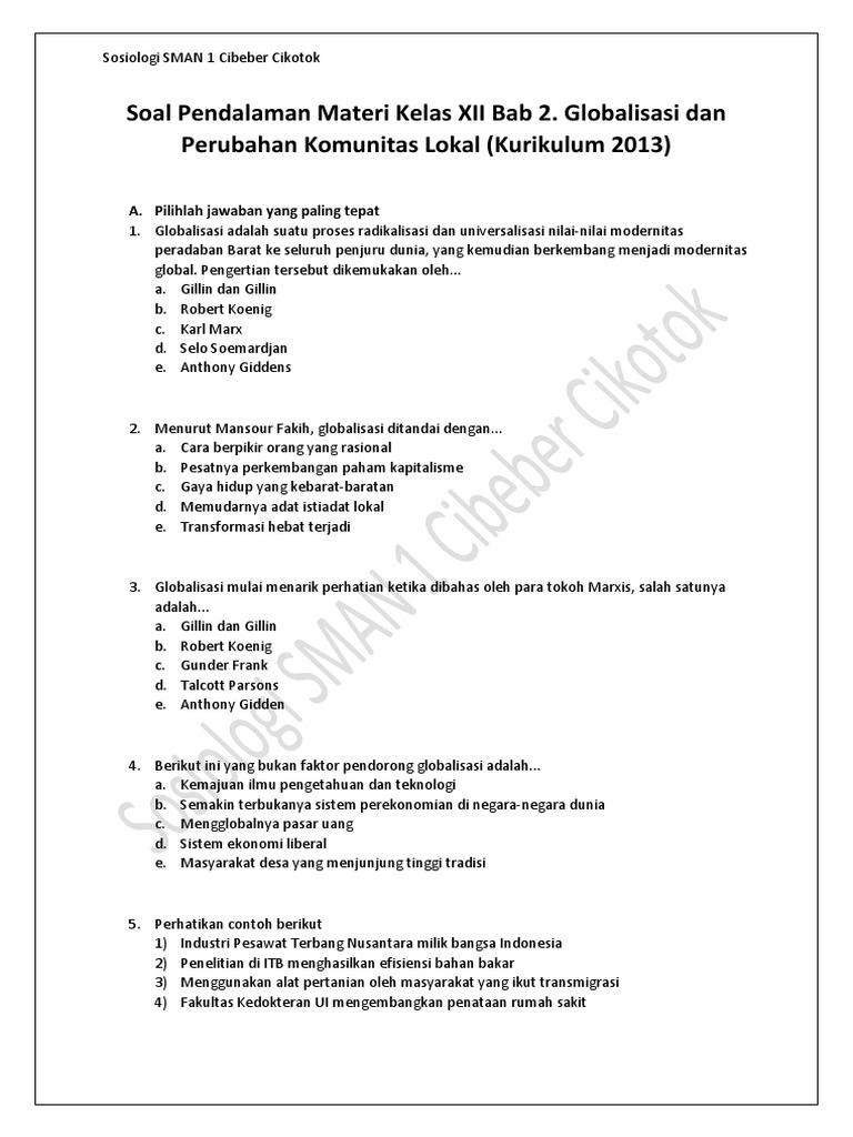 Soal Pendalaman Esai Materi Sosiologi Kelas Xii Bab 2 Globalisasi Dan Perubahan Komunitas Lokal Kurikulum Revisi 2016 Pdf from imgv2-2-f.scribdassets.com Soal pilihan ganda tentang globalisasi dan perubahan komunitas lokal : Soal pendalaman materi esai dan skala sikap kelas xii bab 6. Contoh soal sosiologi kelas 12 semester 1 beserta jawabannya pada tulisan ini berisikan materi tentang perubahan sosial dengan bentuk pilihan ganda. Setelah sebelumnya kita membahas tentang perubahan sosial dan dampaknya terhadap masyarakat, di postingan ini kita bahas materi sosiologi kelas xii tentang globalisasi dan perubahan komunitas lokal yuk. Soal pendalaman materi pilihan ganda kelas xii bab 1. Soal kewirausahaan kelas 12 sma ma 2021 dan kunci jawabannya Soal dan jawaban tentang globalisasi (pilihan ganda, essay). Nurul mitharani/xii ips 2/26 raden intania/xii ips 2/28 salma safira j/xii ips 2/30 santi christina s/xii ips 2/32 siti hana/xii ips 2/34 talitha inas viantono/xii ips 2/36 sma negeri 2 bogor jalan keranji ujung 1 budi agung telp.